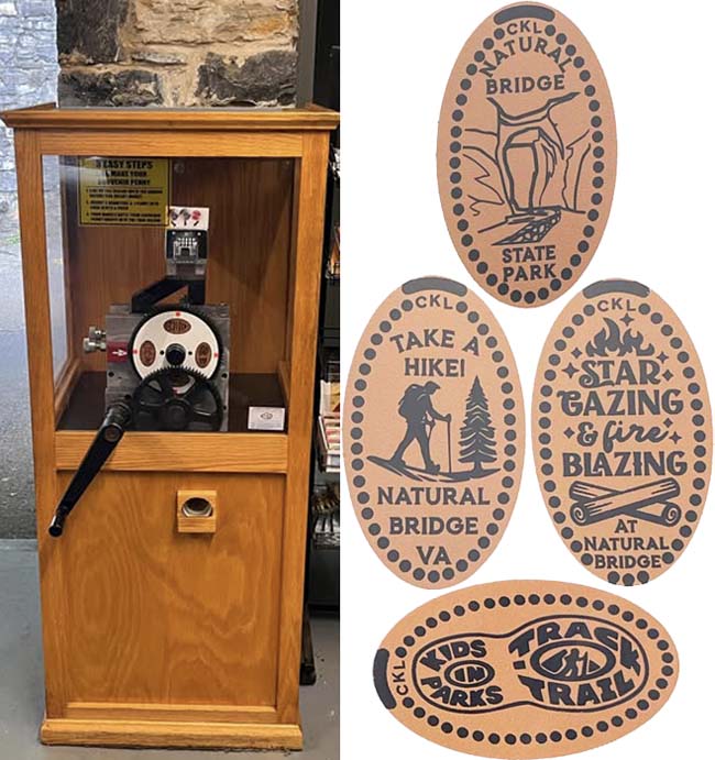camp store is near the river Natural Bridge, VA  7/23/2025, Machine 7 has four new designs and was placed at the camp store near the river. This is not in the main visitor's center. If you go behind the visitors center and walk down the Cedar Creek Trail 200 yards, there is a camp store near the river where machine 7 is.