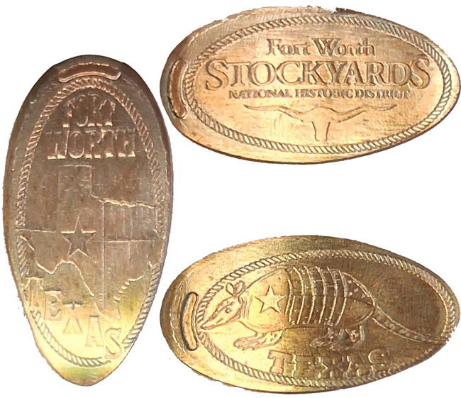 Designs are: 1) 'Fort Worth Stockyards National Historic district', 2) 'Fort Worth', Star in image of state, 3) 'Texas', Armadillo with star on side.