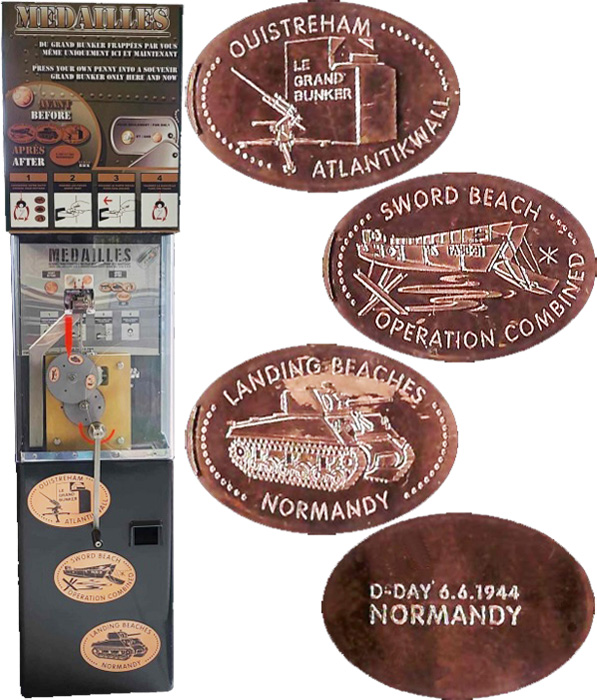 Machine 1 is in the gift shop. Takes a 1 euro coin and a 5 eurocent coin per design. Designs have a beaded border: