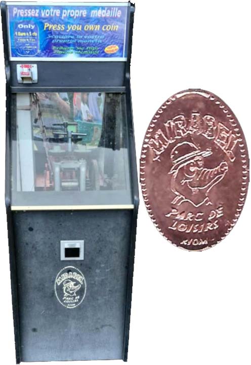 Machine 1 is behind the cash register on the right side. Cost to press: €1.05 each design (1€ coin and a 5 Euro cent coin). Design has a beaded border: