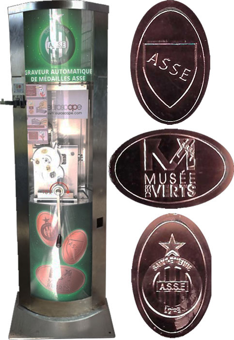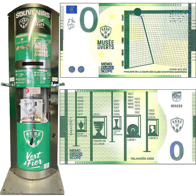 Machine 2 (Placed 7/2023) is a tri-function "penny"/token/"Memoeuro" (souvenir banknote currency replica) machine encased in the same machine. It presses "pennies" OR dispenses a token OR dispenses a Memoeuro. The machine has two coin slots. The machine has a coin slot that only accepts €2 cost for each "penny" (A 2€ coin or two 1€ coins only Machine does not give change). The "penny" will be pressed on a supplied 5 Euro cent. When you insert the coins into the slot for the "penny, wait 5 seconds for the supplied 5 Euro cent to drop into place before cranking the handle. The machine has a second coin slot that only accepts €2 cost for each token OR Memoeuro (A 2€ coin or two 1€ coins only Machine does not give change). Once you insert the coins into the second coin slot, you MUST press the button for token OR the Memoeuro.