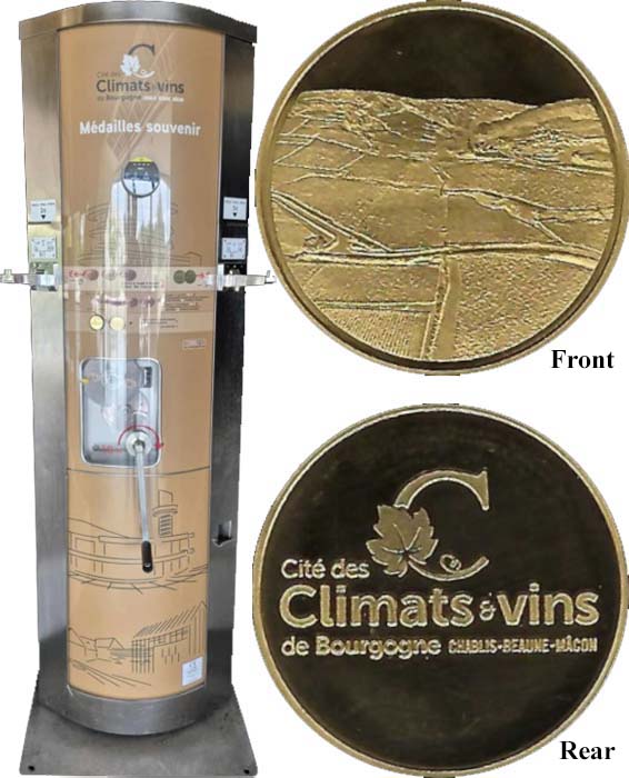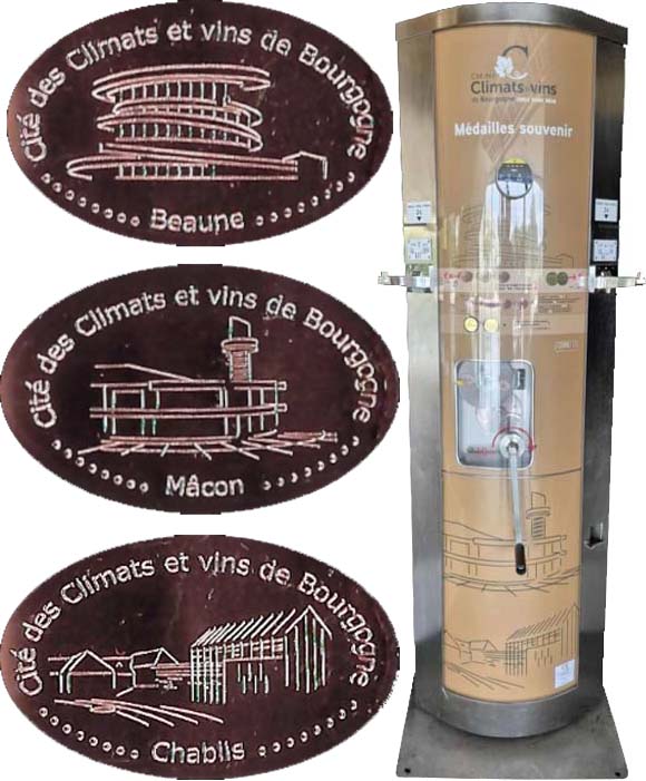 Machine 1 (Eurocent) (Placed 9/2024) is in the entry foyer. Cost to press: €2 each design (A 2€ coin or two 1€ coins only Machine does not give change). The "penny" will be pressed on a supplied 5 Euro cent. When you insert the coins into the slot for the "penny", wait 5 seconds for the supplied 5 Euro cent to drop into place before cranking the handle. Designs all have a beaded border with 'Cité des Climats et Vins de Bourgogne'.