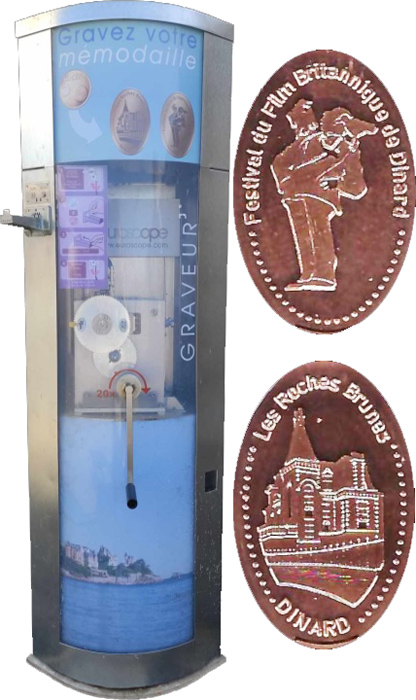 Machine 1 is outside a short distance from the statue in front of the restrooms / underground passage. Cost to press: €1.05 each design (A 1€ coin and a 5 Euro cent coin). Designs all have a beaded border with 'Dinard':