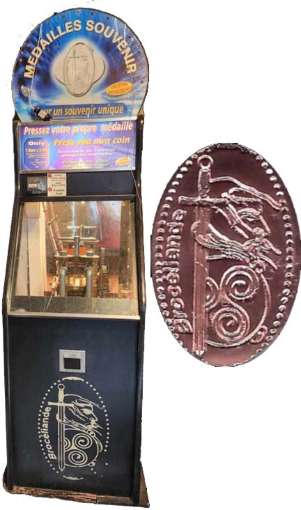 Machine 1 is outside in front of the entrance. Cost to press: €1.05 each design (A 1€ coin and a 5 Euro cent coin). Design has a beaded border: