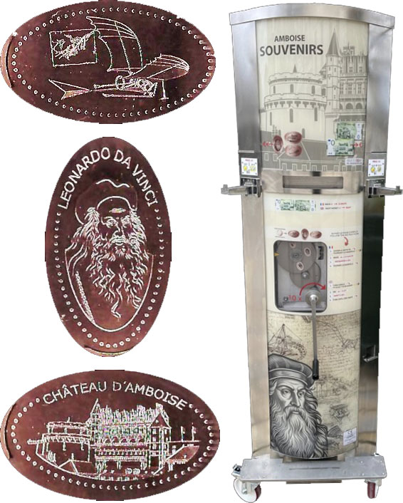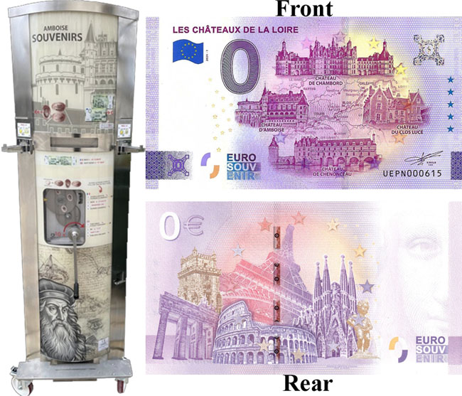 Machine 1 (Placed 03/2025) is a Euroscope dual function machine that presses euro cents OR dispenses a "Memoeuro" (souvenir banknote currency replica).