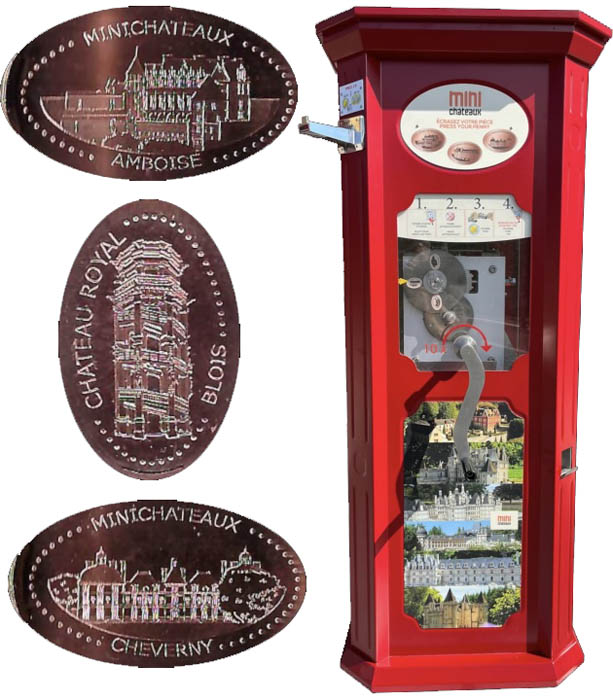 Machine 1 is behind the cash register at the beginning of the tour. Cost to press: €2 each design (a blank for pressing is supplied). Designs all have a beaded border with 'Minichâteaux':
