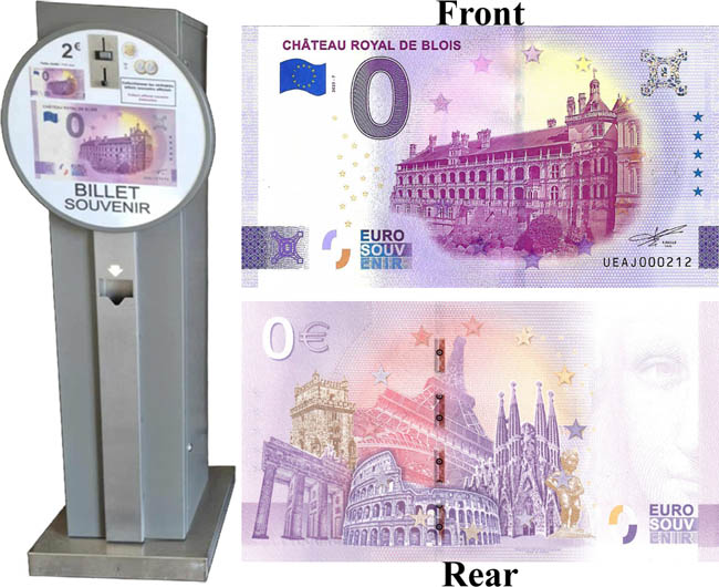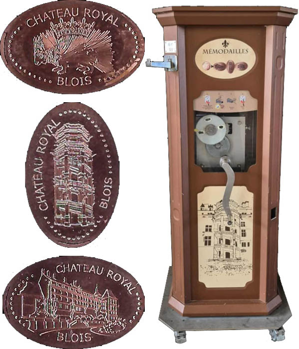 Machine 1 is located at the top of the Place du Château near the Chateau entrance. €1.05 each design (A 1€ coin and a 5 Euro cent coin. Designs all have a beaded border with 'Chateau Royal Blois':