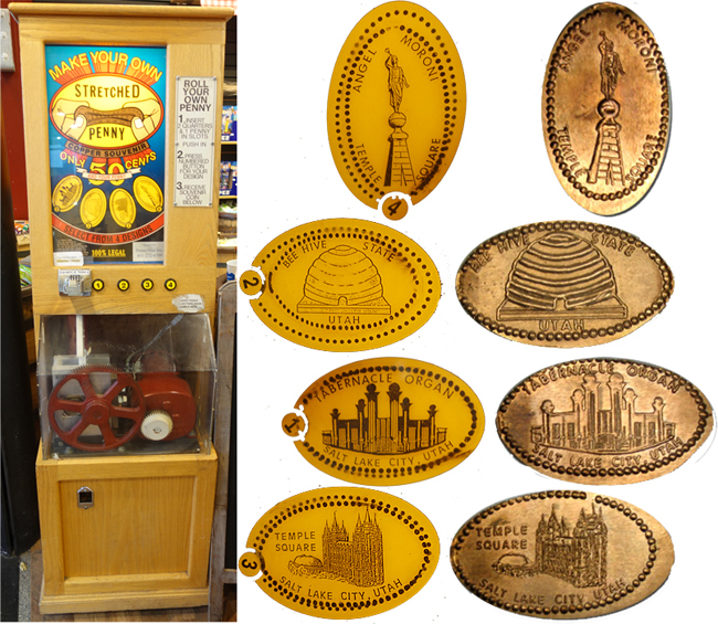 Moved 1: (Moved here 7/2020) is inside to the left of the entrance door. Cost to press: 51¢ each design. Designs all have a beaded border: