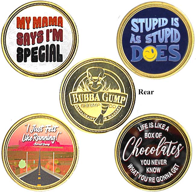 The Bubba Gump machine is inside by waiting bench. All 4 designs have “Orlando FL” or “Orlando Florida” on them. Designs are: