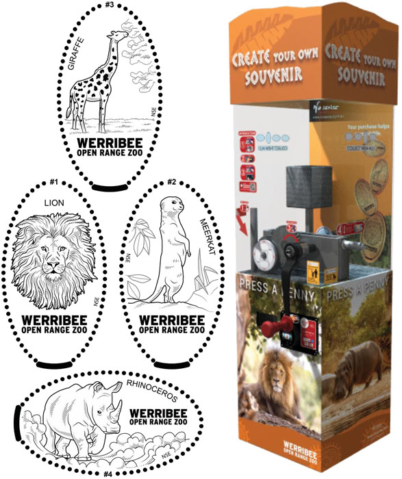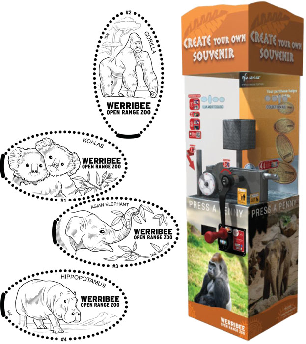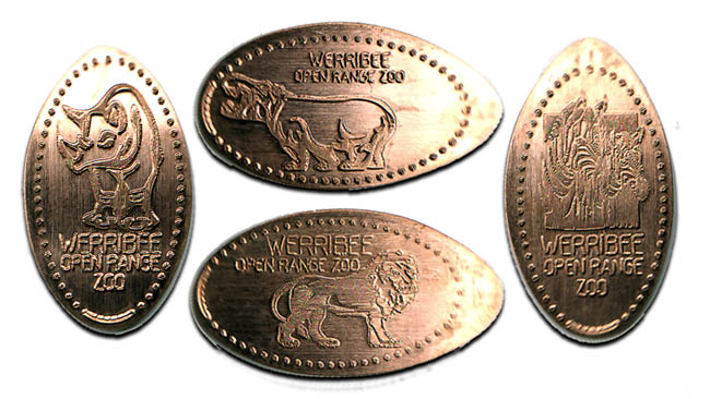 K Rd VIC - Werribee, Australia Website 18/9/16 - Two machines both containing copper blanks. Cost is $2 per penny. Both working great. Change can be obtained from gift shop. They also sell a penny book - same as available across the 3 Melbourne Zoo locations.