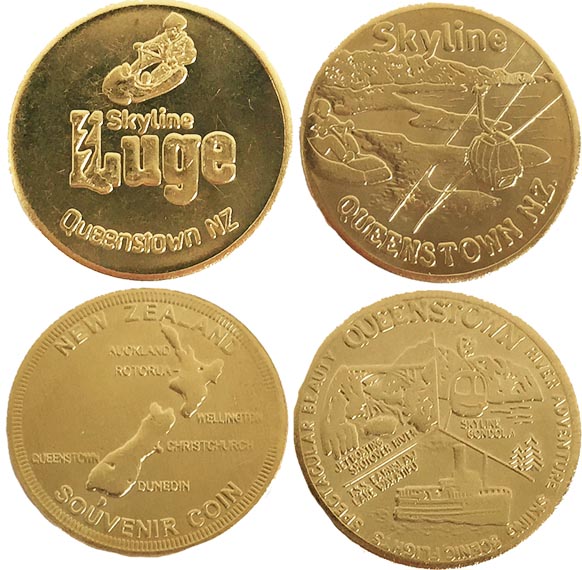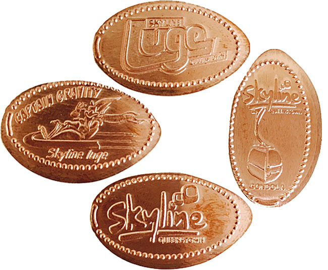 Retired (Penny) 1: 1) 'Skyline Queenstown', logo, 2) 'Skyline Queenstown', Gondola, 3) 'Captain Gravity Skyline Luge', in a luge, 4) 'Skyline Queenstown', ', Logo.