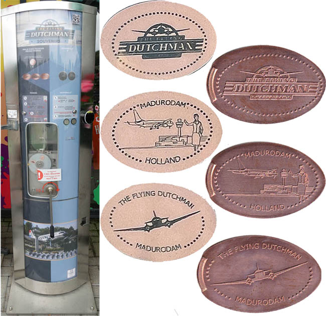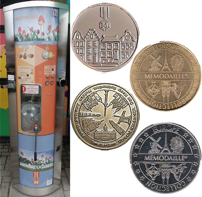 These machines are all dual "penny"/token machines encased in the same machine. It presses "pennies" and dispenses tokens. Each machine has one coin slot that accepts €3 cost for each "penny" or token (A 2€ coin or two 1€ coins only Machine does not give change). The "penny" will be pressed on a supplied 5 Euro cent. Credit cards are accepted for either "pennies" or tokens. Once you insert the coins or pay by credit card, you MUST press the button for pennies or your choice of tokens. When you press the button for pennies, wait 5 seconds for the supplied 5 Euro cent to drop into place before cranking the handle.