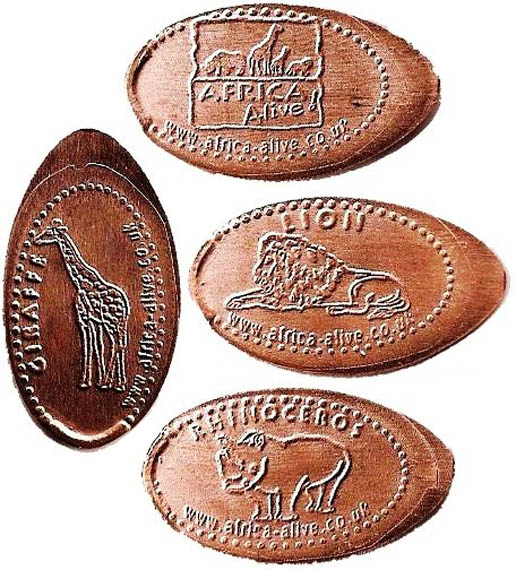 Retired 1: 1) h. Africa Alive logo 2) h Rhinoceros, image with text 3) h. Lion, image with text 4) v. Giraffe, image with text.