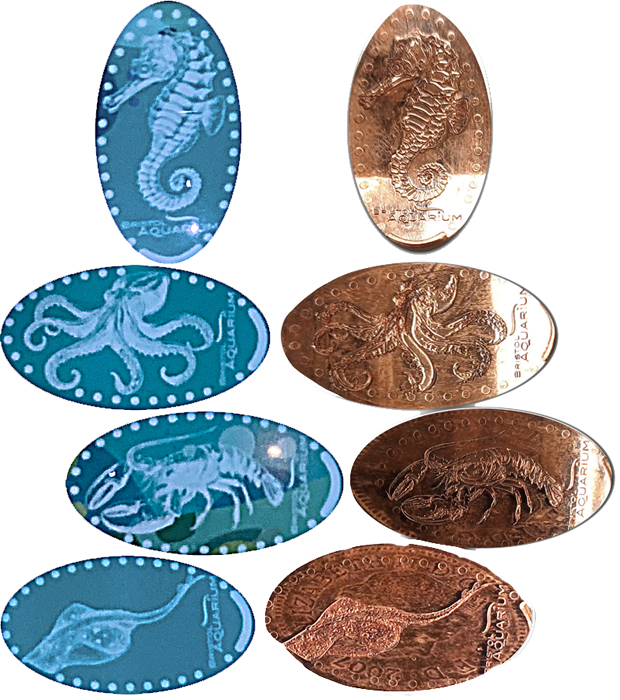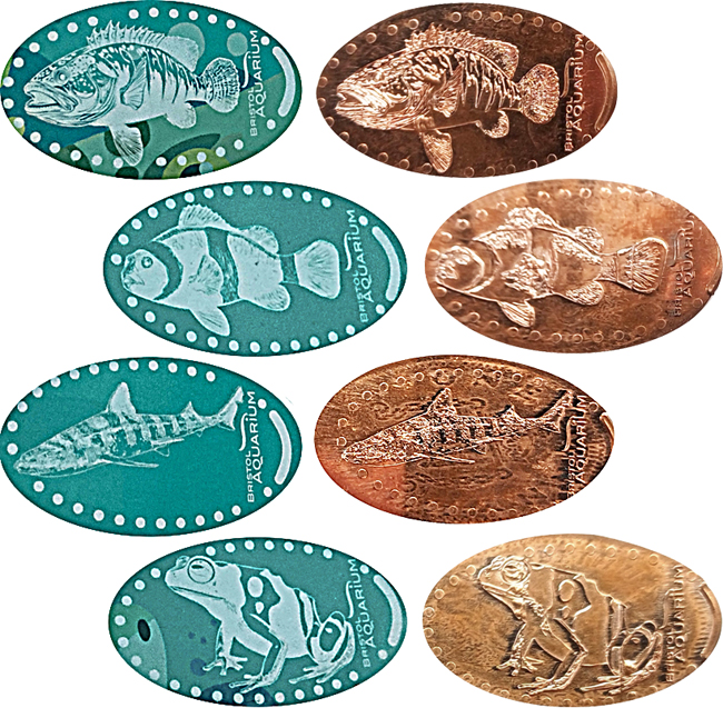 Machine 6: is located in the entrance to the coral reef section. All have 'Bristol Aquarium on them. Costs £2 per penny and is contactless