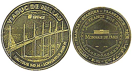 Retired Token Machine 1: 1) Obverse: Viaduct bridge (Elevated roadway) with 'Viaduct De Millau'./ Reverse: 28 stars surrounding Monnaire de Paris building with 'France in 8 different languages 2010 Monnaire de Paris'